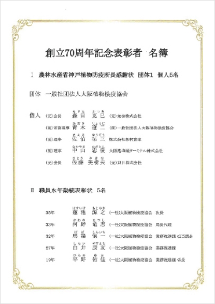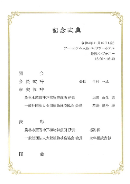 本日、本式典においてこれまで大阪港における国の行う植物検疫事業の円滑な推進に貢献、当協会の育成発展に尽力された方々に対し、農林水産省神戸植物防疫所所長より感謝状が授与されることになりました。お手元のしおりに受賞者の方々を紹介し、お祝いと感謝の意を表する次第です。